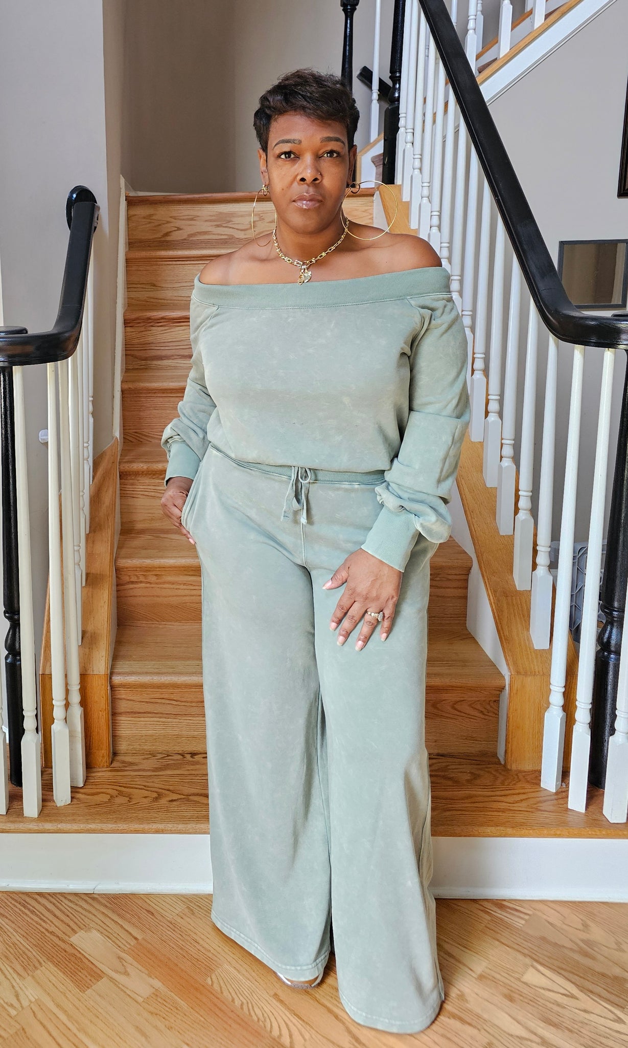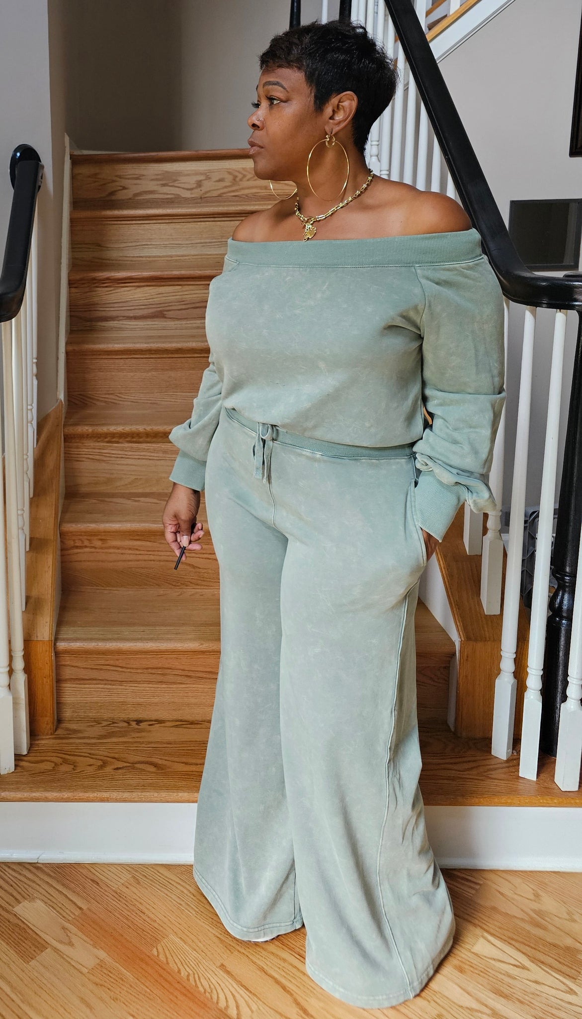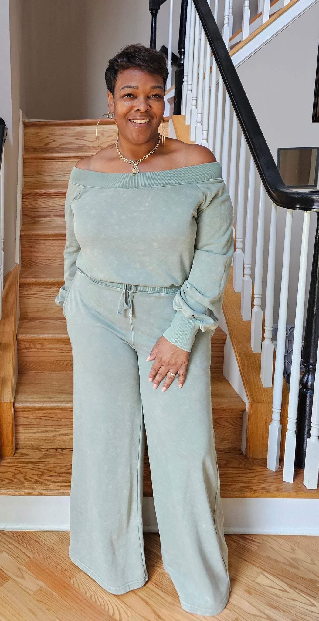 This Wideleg Off-Shoulder Jogger Suit is all things Fall. The occasion doesn't matter This Jogger Suit is the main event. Drawstring waist and elastic band around the top.