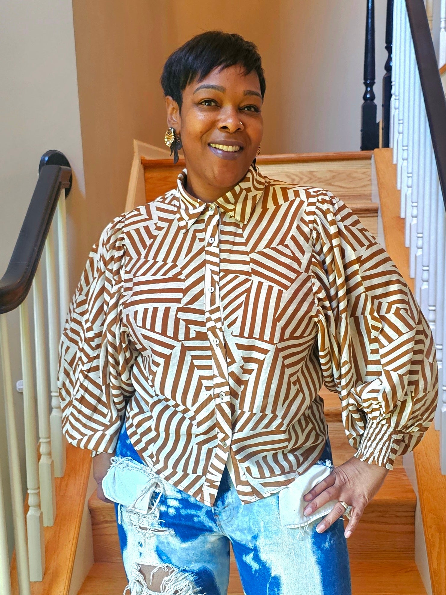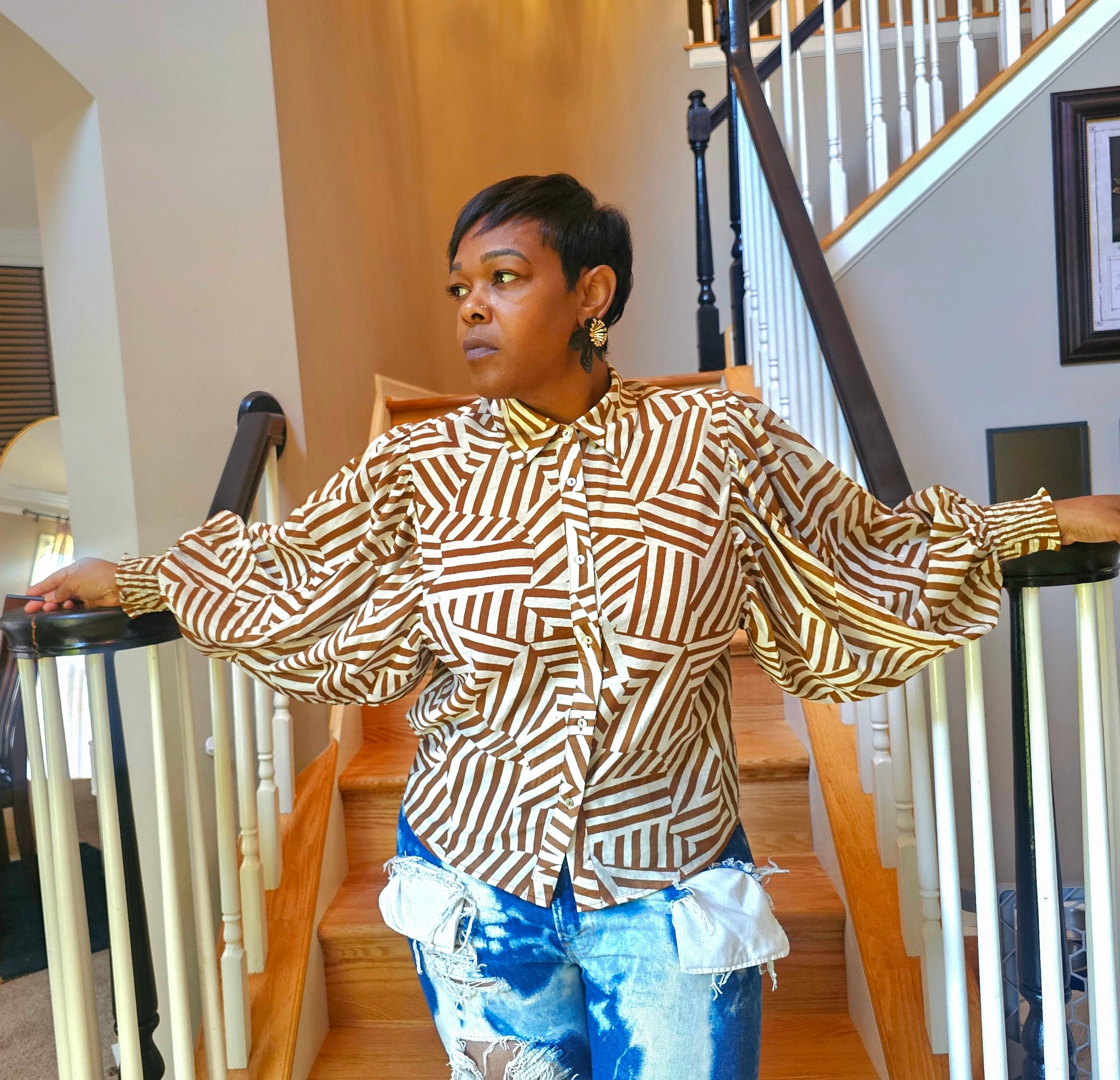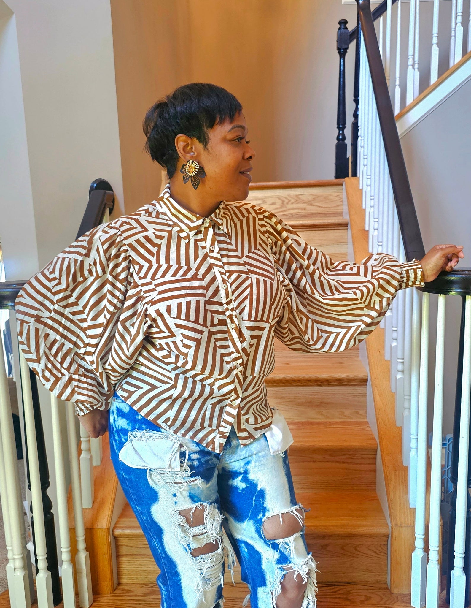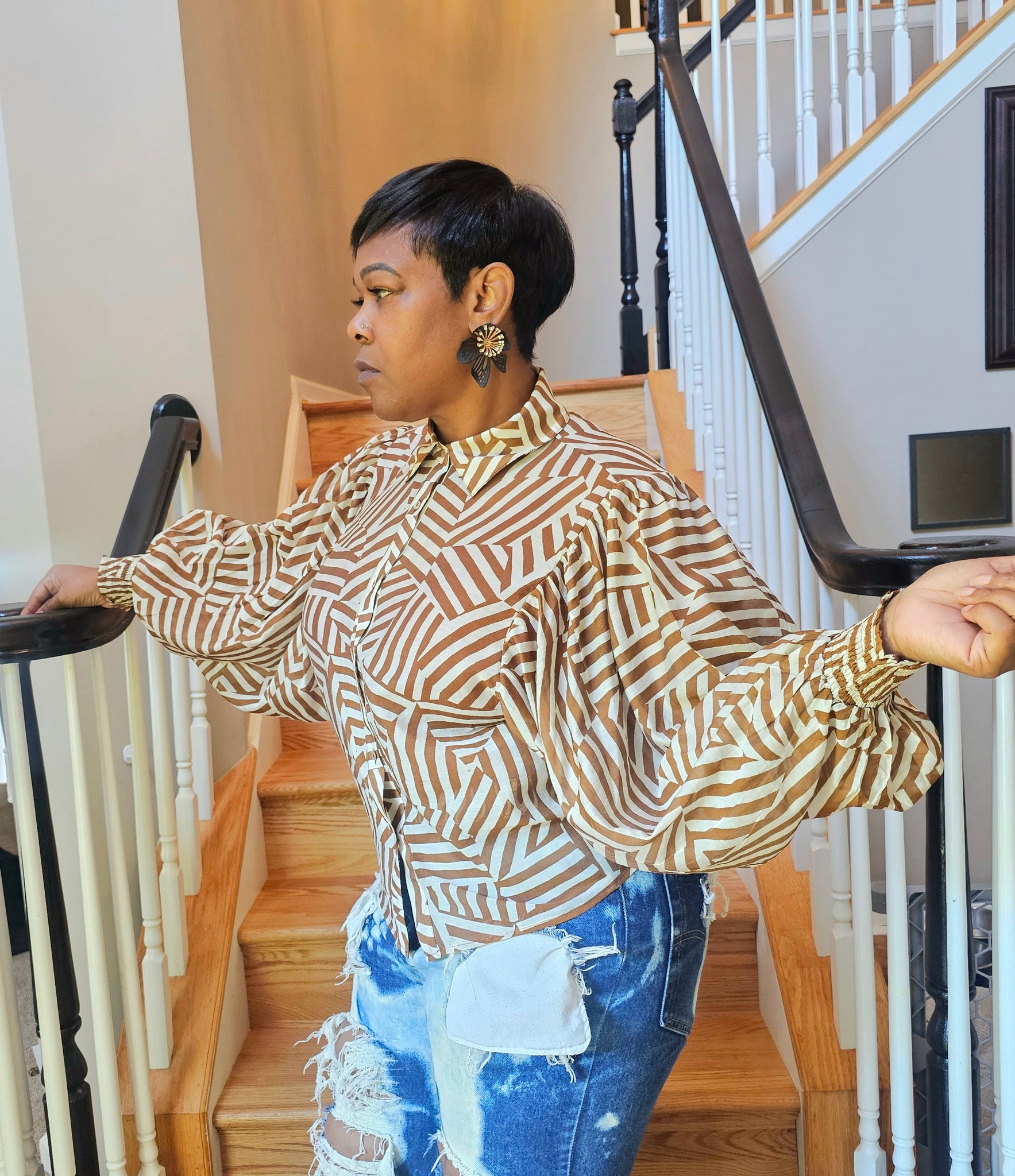 Statement Made. With this Aztec button-down design throughout and Elephant Sleeves for a little drama. This top has no stretch but has a generous fit. Pair with ANYTHING and the look is complete!