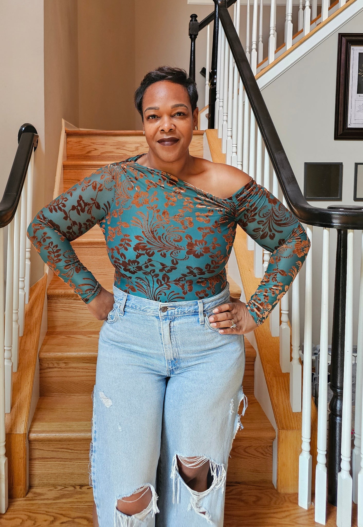 Definitely a date night, girls night or just cause I want to night. This Teal sheer like material with chocolate brown velvet detail is BEAUTIFUL. Great stretch.